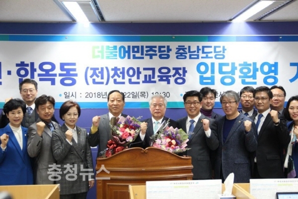 전)천안교육장 출신인 황봉현, 한옥동 교육전문가가 22일 오전 천안시청 브리핑실에서 기자회견을 열고 나란히 더불어민주당에 입당했다.
