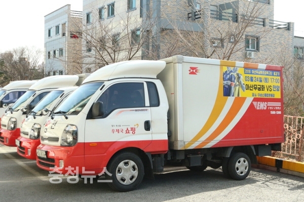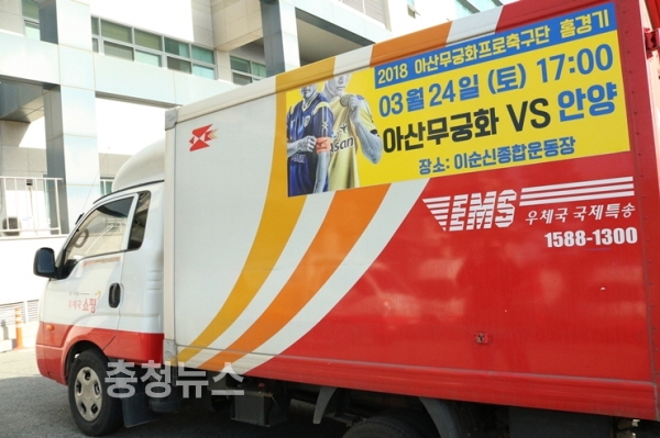 지역 축구발전을 위해 지난 1월 아산우체국과 상호 교류 협약 맺은 아산무궁화프로축구단 아산 우체국 택배차량 활용한 2018시즌 아산무궁화프로축구단 홈경기 홍보 나섰다.