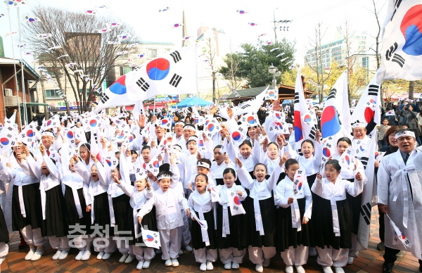 대전 유성구는 지난 24일 유성시장 장터공원에서 지역 주민 400여 명이 참여한 가운데 1919년 독립만세 운동을 재현했다고 밝혔다.
