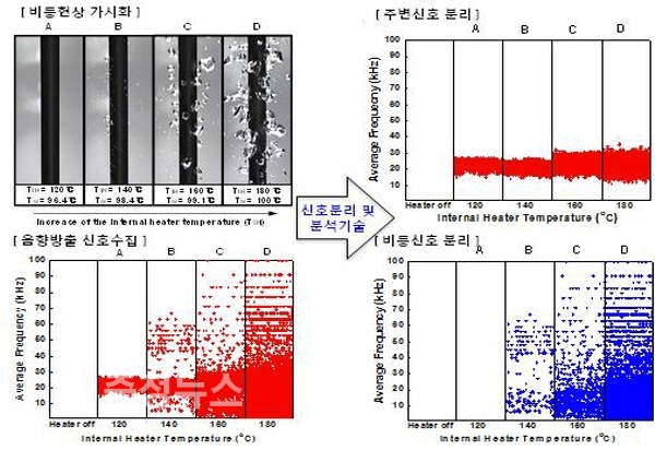 원자력연구원 원자력재료연구부 심희상, 허도행 박사 연구팀이 개발한 ‘냉각수 비등현상 음향방출 탐지·분석기술’은 잠수함 음향탐지 등에서 사용되는 기술을 활용한 것으로, 핵연료피복관에 설치한 센서로 고온고압 조건에서 기포 발생시 나타나는 음파를 탐지, 실시간으로 기포 발생 여부와 발생량을 분석한다. 연구팀은 탐지 장비는 물론 환경신호와 기포 발생 신호를 분리할 수 있는 분석방법도 개발했다.