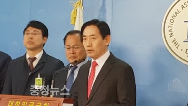 자유한국당 정용선 충남지사 예비후보가 26일 긴급 기자회견을 열고 도지사 후보에 대한 전략공천 방침을 철회해달라고 요청했다.