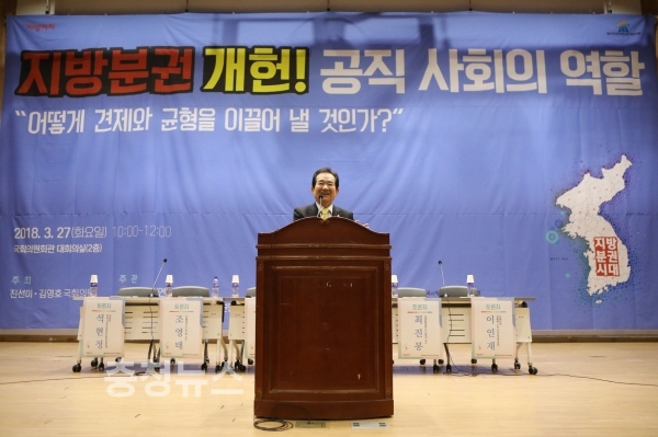정세균 국회의장은 27일 오전 국회의원회관 대회의실에서 열린 '지방분권 개헌! 공직사회의 역할' 토론회에 참석해 축사를 했다.
