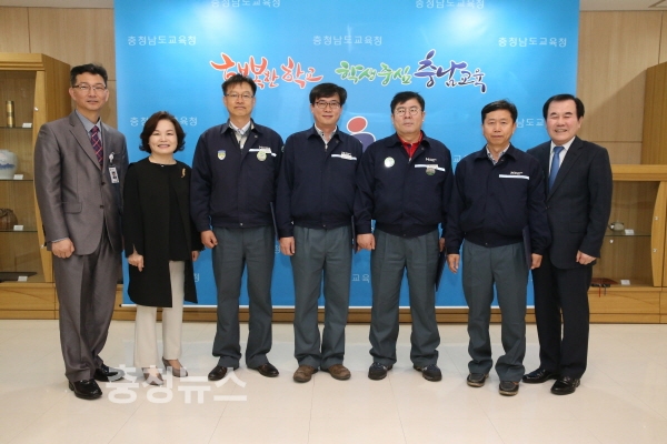 (좌)김유태 학교정책과 진로진학팀장, 가경신 학교정책과장, 현대제철 김병집 명장, 이윤범 명장, 신우영 명장, 이광택 명장, 김지철 충남교육감