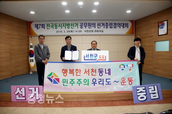 충남 서천군(군수 노박래)이 지난 29일 군청 대회의실에서 간부공무원 등 120여명을 대상으로 제7회 전국동시지방선거에 공무원 선거중립을 위한 실천 결의대회 및 공직선거법 특별교육을 실시했다.
