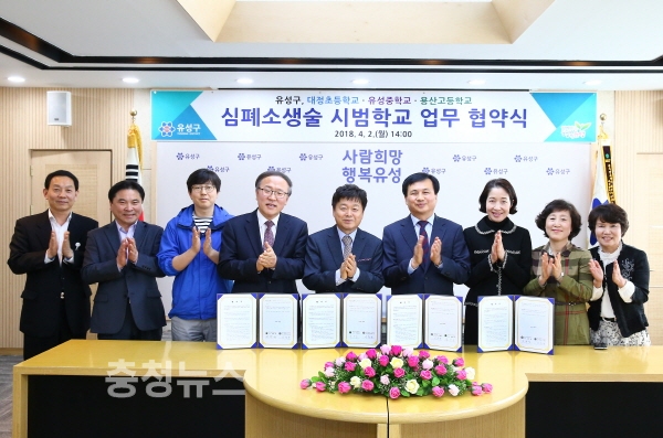 대전 유성구는 2일 구청 중회의실에서 대정초등학교(교장 김향림), 유성중학교(교장 박찬희), 용산고등학교(교장 정흥채)와 심폐소생술 시범학교 운영을 위한 업무협약을 체결했다.