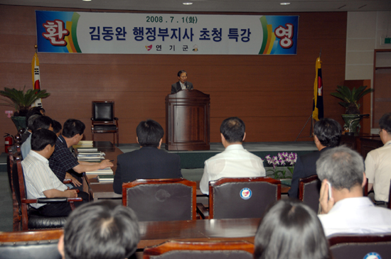 김 부지사는 1일 오후 연기군청을 방문하여 남궁 주 부군수로부터 간부신고를 받은 후 군정현황을 청취하고 연기군의회를 방문하여 의원들과 대화를 가진 후 연기군 직원 120명을 대상으로 특강을 실시했다.