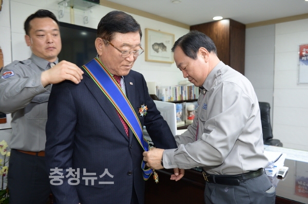 김석환 홍성군수 한국청소년연맹으로 부터 청소년대훈장 수여 모습