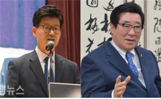 더불어민주당 공주시장 예비후보 김정섭 前 청와대 행정관(왼쪽), 윤석우 前 충남도의회 의장 / 조홍기 기자