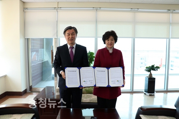박산우(좌측) 국립장성숲체원장이 광주 북구 오치동 소재 광주광역시교육연수원에서 고향숙 원장과 ‘지속가능 발전교육’ 실현을 위한 업무협약(MOU)을 체결한 뒤 기념촬영