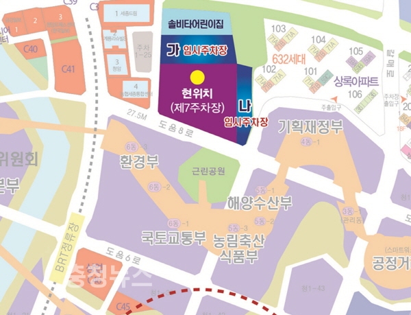 행복청은 ‘복합체육시설’ 공사기간 동안 정부세종청사 직원과 방문객의 주차 불편을 최소화하기 위해, 올해 공사구간에 해당하지 않는 제7주차장 부지 상부의 약 380면을 올해 말까지 그대로 사용하고,