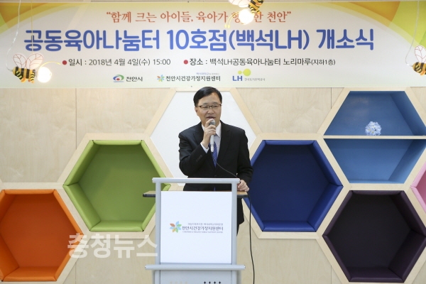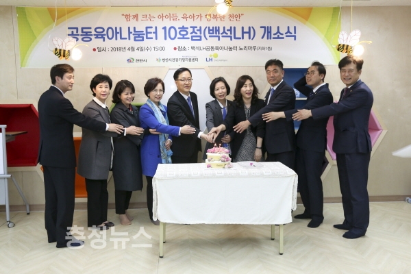 충남 천안시와 천안시건강가정지원센터(센터장 이은정)는 지난 4일 ‘공동육아나눔터 10호점’(백석LH점)을 백석LH천년나무 1단지 아파트 내에 개소했다.