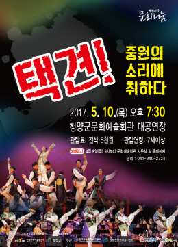 충남 청양군은 오는 5월 10일 저녁 7시 30분 문예회관 대공연장에서 충주시립우륵국악단의 ‘택견! 중원의 소리에 취하다’를 공연한다고 5일 밝혔다.