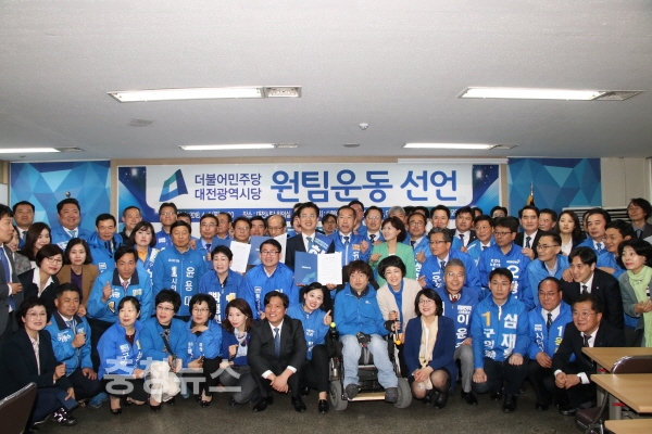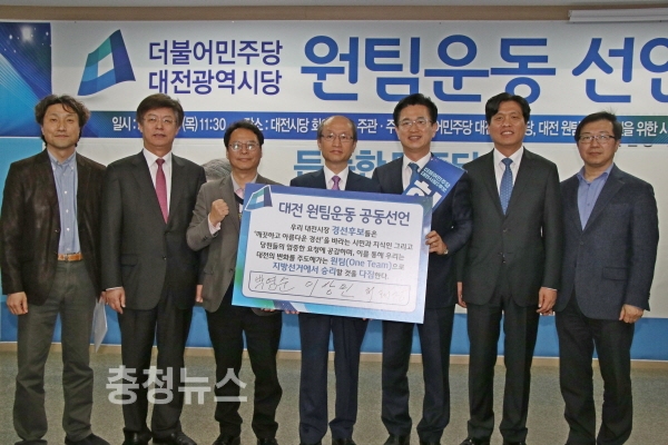 더불어민주당 대전시당과 대전 원팀운동 추진을 위한 시민모임이 5일 오전 시당 회의실에서 ‘원팀운동 공동선언’을 발표했다.