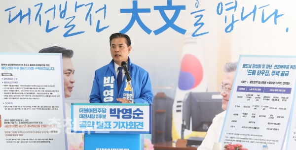 박영순 더불어민주당 대전시장 예비후보는 정부가 추진 중인 ‘광역교통청’ 원도심 유치와 삶의 질 향상을 위한 생활밀착형 공약 중심의 2차 정책공약을 발표했다.
