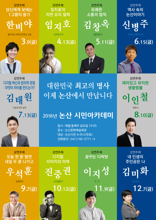 지난 3월 오지탐험가 한비야씨 특강으로 문을 연 논산아카데미는 앞으로 △김창옥 소통전문가(5.11) △신병주 건국대 사학과교수(6.15) △김태원 구글코리아 상무(7.13) △이인철 변호사(8.10) △우석훈 경제학자(9.7) △진중권 시사평론가(10.12) △이지성 작가(11.9) △김미화 개그우먼(12.7) 등 사회 각 분야의 저명인사들의 강연으로 이뤄진다.