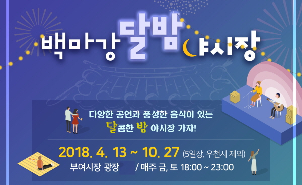 2018년 백마강 달밤시장(부여시장 야시장)은 오는 13일 전야제를 시작으로 14일은 개장식을 열고, 10월 27일에는 폐장한다. 시간은 오후6시(18시)~11시(23시)까지 부여시장 광장(부여읍 성왕로 173번길 12)에서 운영될 예정이다.