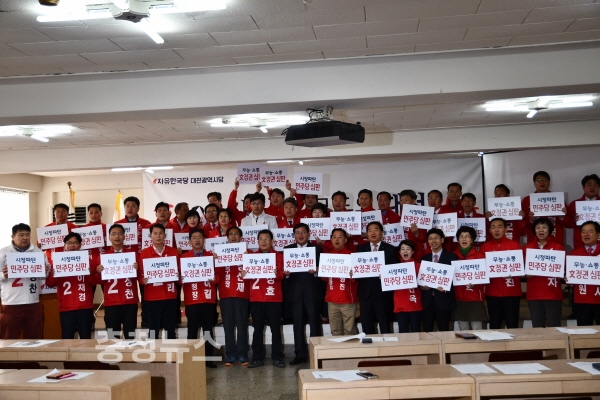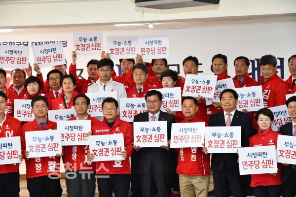 후보자들은 또 ‘시정파탄 민주당과 무능한 문재인정권 심판’ 이라는 문구의 피켓을 들고 구호를 외치며 자유한국당의 6.13 지방선거 필승을 다짐했다.
