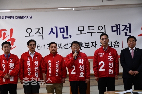 박성효 대전시장 후보는 “자유한국당이라는 큰 배에 탄 후보자들이 대전시를 구하겠다는 열정과 각오로 부지런하게 노를 젓고 상호협력 한다면 반드시 목적지에 도착할 수 있을 것” 이라며 “후보자 모두가 진정성을 가지고 대전 시민들께 다가간다면, 그 뜻이 반드시 통하리라 생각한다. 민주당의 오만함을 자유한국당의 성실함으로 극복해 반드시 승리하자”고 강조했다.