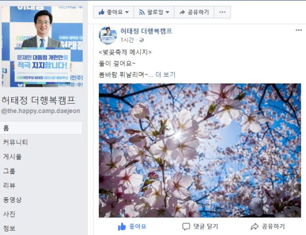 허 후보는 6일 페이스북(허태정 더행복캠프)에서 “오늘부터 대전 마을 곳곳에서 벚꽃 축제가 열린다. 연인, 가족과 함께 하면 좋은 날”이라고 운을 뗀 뒤 지역의 벚꽃축제를 소개하면서 특색 있는 마을 축제 활성화의 필요성을 강조했다.