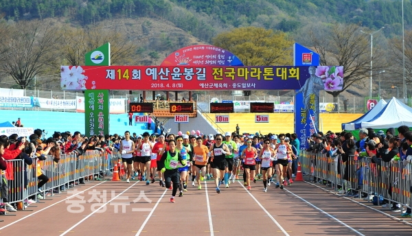 충남 예산군의 대표 벚꽃길인 벚꽃로를 따라 펼쳐진 ‘제14회 예산윤봉길 전국마라톤대회’가 8일 예산종합운동장과 벚꽃로 일원에서 성공적으로 개최됐다.