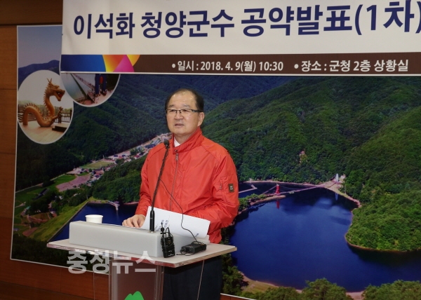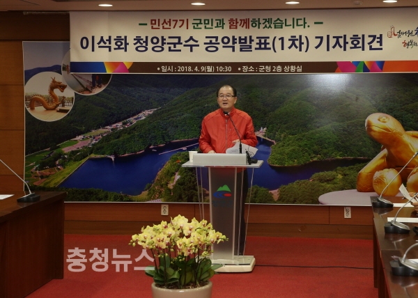 이어 "저 이석화가 다시 군수가 되어 우리 청양군을 전국에서 가장 으뜸가는 지역으로 반석위에 올려놓겠다는 약속을 드리면서 오늘은 우선 1차로 제가 군수가 되면 강한 추진력으로 역점을 두고 추진할 주요사업을 발표하겠다"고 밝혔다.