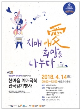 세종시가 오는 14일 오전 9시 세종호수공원에서 한마음 치매극복 전국걷기행사를 개최한다.