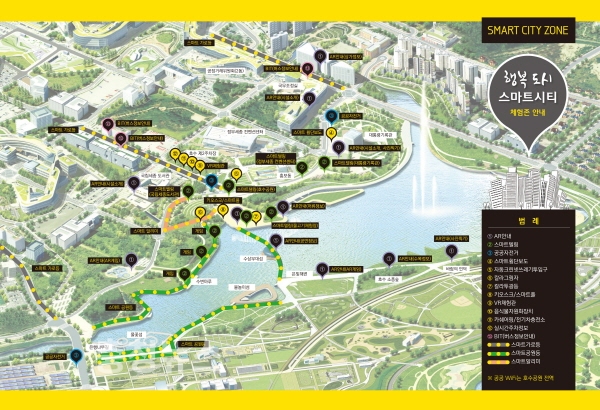 ▲스마트 알리미(미세먼지, 응급상황) ▲스마트 가로등과 공원등(차량과 사람 인식 밝기 조절) ▲서비스 안내 키오스크 ▲전기차 충전소 등이 있다.