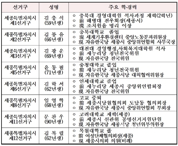 자유한국당 세종시의원 8개 선거구 후보자 확정(프로필) / 충청뉴스 최형순 기자