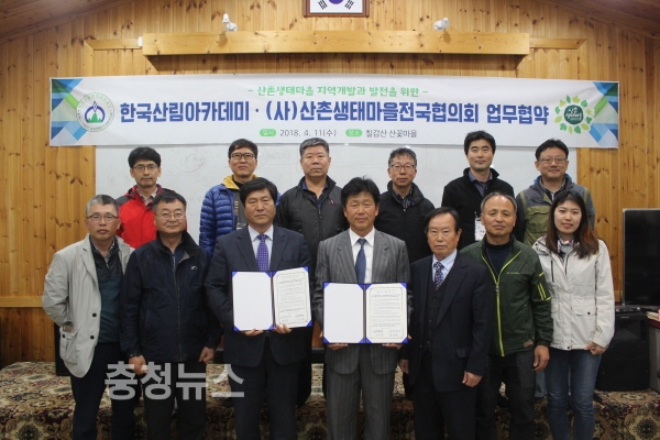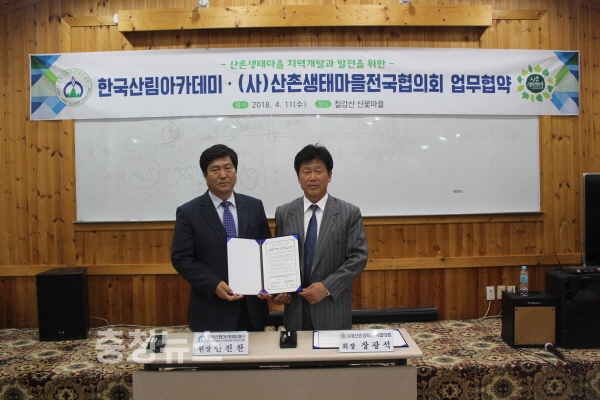 한국산림아카데미(원장 안진찬)와 (사)전국산촌생태마을전국협의회(회장 장광석)이 지난 11일 칠갑산 산꽃마을에서 업무협약(MOU)을 체결했다.