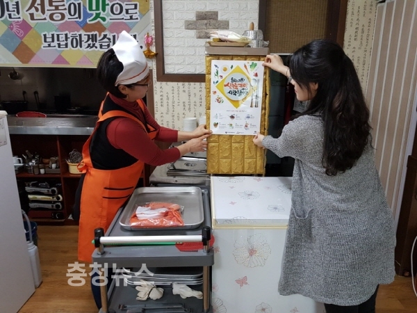 식중독 예방 홍보 포스터를 업소에 부착하고 있다.