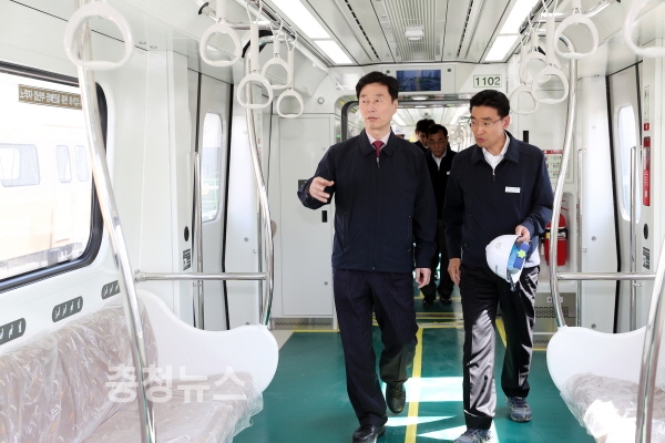 김상균 이사장(왼쪽)이 김포도시철도 차량에 탑승하여 품질 등을 점검했다.