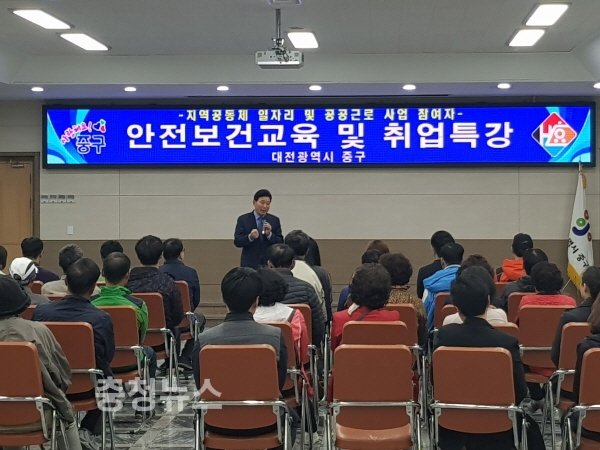 대전 중구(구청장 박용갑)는 16일 지역공동체일자리 및 공공근로 사업 참여자와 사업담당자등 40여명을 대상으로 안전보건교육을 실시했다.