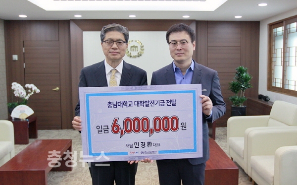 민 대표는 “평소에 해담을 많이 찾아주시는 충남대 교수, 직원 분들께 감사하는 뜻을 담았다”며 “비록 많지 않은 금액이지만 충남대 발전에 조금이나마 도움이 되었으면 좋겠다”고 말했다.