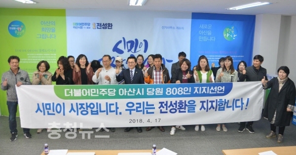 더불어민주당 아산시 당원 808인이 17일 아산시 용화동 선거사무실에서 전성환 아산시장 예비후보 지지를 선언했다.