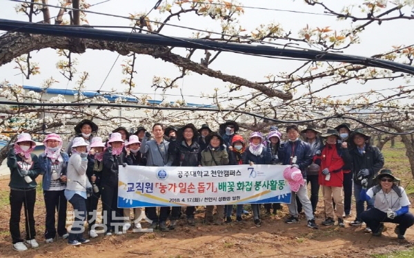 공주대학교(총장직무대리 김희수) 공과대학 천안캠퍼스에 근무하는 교직원 26명은 18일 천안 직산 일원에 있는 배 과수 농가를 방문해 배꽃 인공수분 봉사활동을 펼쳤다.