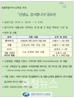 공모기간은 오는 5월 2일까지이며 담당자 이메일(sincerity@korea.kr)로 접수하면 되며, 자세한 사항은 교육청 교원인사과에 문의하면 된다.