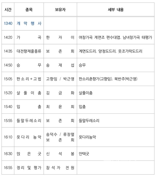 시 무형문화재 제14호 가곡(歌曲) 보유자 한자이의 ‘여창가곡’을 시작으로 승무, 살풀이춤, 웃다리농악 등 10개 예능종목의 공연이 이어진다.