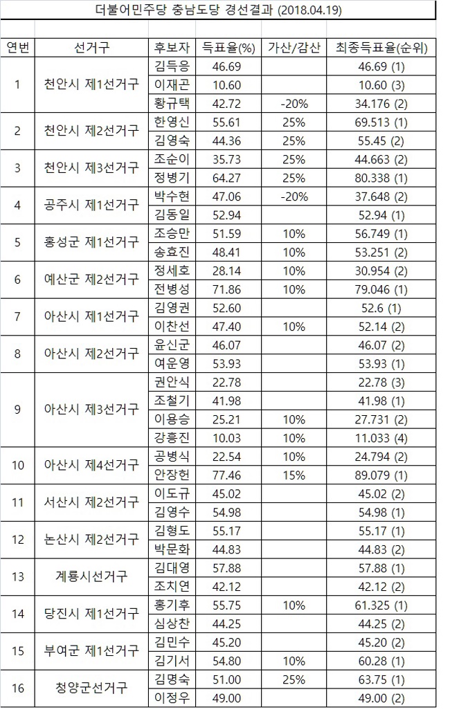 더불어민주당 충남도당은 18일부터 19일까지 이틀간 진행된 6‧13지방선거 광역의원 16개 선거구 경선결과를 19일 오후 늦게 발표했다.