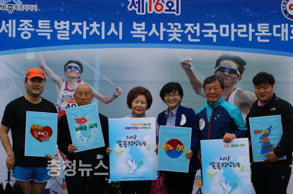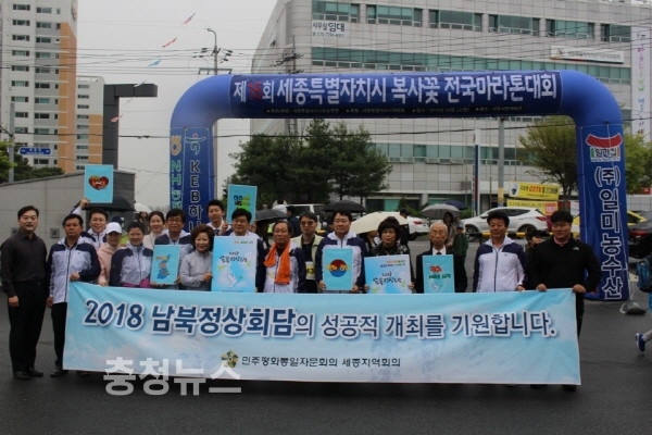 민주평화자문회의 세종지역회의(부의장 고희순)가 22일 조치원 시민체육관에서 세종시 복사꽃마라톤대회에 참석한 시민들을 상대로 ‘남북 정상회담 성공적 개최’를 위한 퍼포먼스를 펼쳤다.