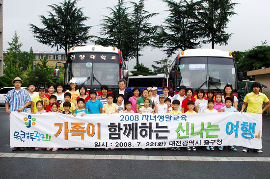 가족과의 여행을 통해 가족의 중요성을 인식하고, 건전한 청소년으로서의 성장을 위해 마련된 이번 행사는 아침 8시 중구청 정문에서 출발해 현충사를 관람, 테마온천을 방문하는 등의 프로그램으로 진행됐다.