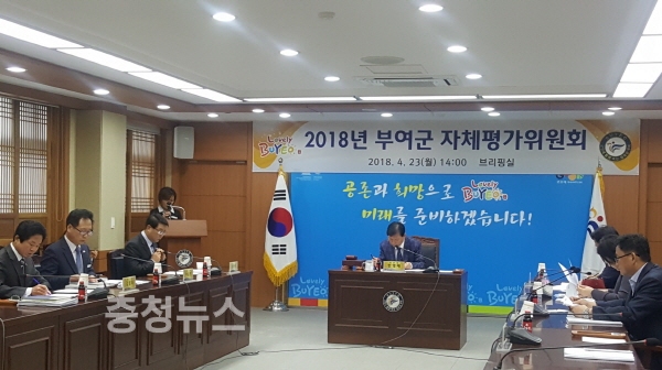 충남 부여군(군수 이용우)은 지난 23일 민간전문가와 관계공무원 등 10여명이 참석한 가운데 ‘2018년 자체평가위원회(위원장 한영배 부군수)’를 개최했다.