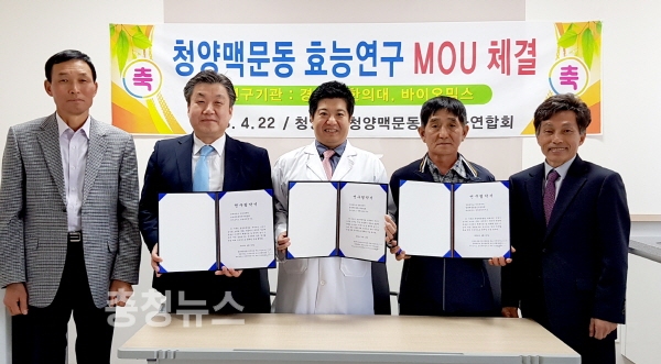 경희대 한의과대학 배현수교수팀과 바이오믹스 연구소(대표 홍성빈), 청양맥문동생산자연합회(대표 이인석)는 지난 22일 경희대에서 산학협력 ‘청양맥문동 효능 연구 MOU’를 체결하고 본격 연구에 들어 갔다.