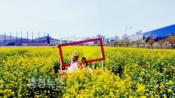충남 서산테크노밸리에 조성된 유채꽃밭이 도심 속 꽃놀이 명소로 가족단위 나들이객들의 큰 호응을 얻고 있다.