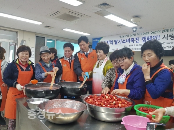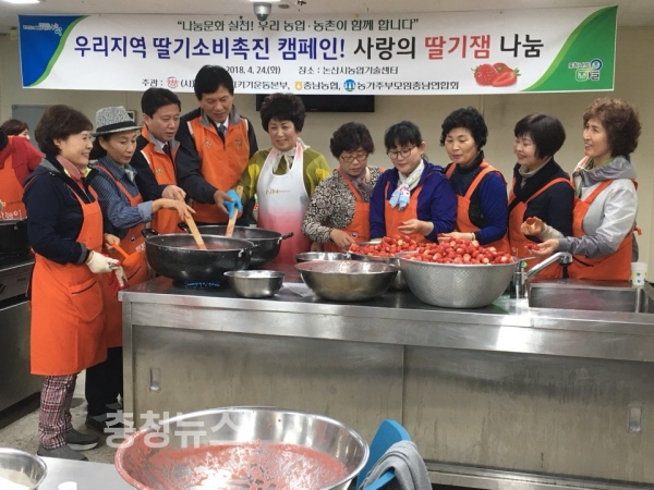 농협 충남지역본부(본부장 조소행)는 우리농업지키기운동본부(충남본부장 류병관)과 함께 농가주부모임 충남연합회(회장 김금자)을 찾아 24일 논산시농업기술센터에서 농협임직원, 농가주부모임회원 등 50여명과 함께 이웃사랑을 실천을 위한 딸기잼 나눔 행사를 가졌다.