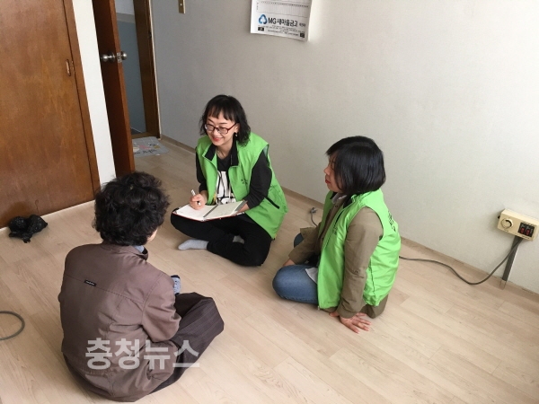 신탄진동 사회복지 담당자가 거동이 불편한 어르신을 찾아가 신청서를 설명하고 있는 모습