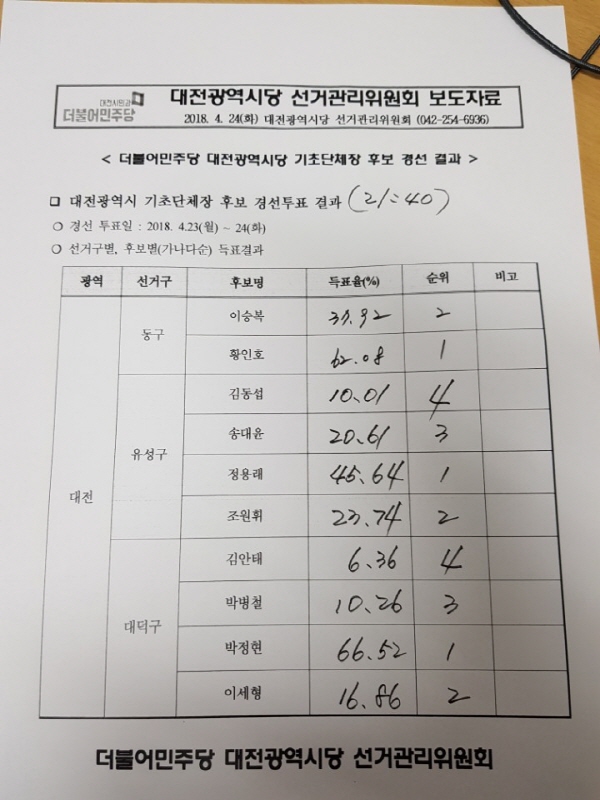 민주당 대전시당 공관위는 이날 3곳을 발표함에 따라 대전지역 5곳 구청장(기초단체장) 공천을 마무리 했다.