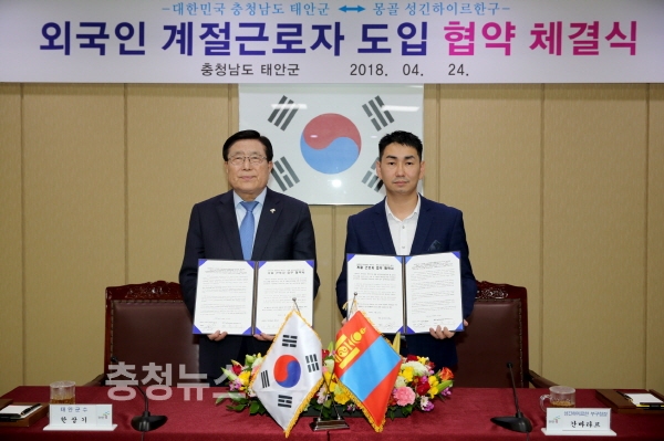 충남 태안군은 지난 24일 군청 소회의실에서 한상기 군수와 몽골 성긴하이르한 구 간바타르 부구청장 등이 참석한 가운데 ‘외국인 계절근로자 협약’을 체결하고 농·어번기 일손부족 현상 해결을 위한 ‘외국인 계절근로자 프로그램’ 도입에 합의했으며, 중국 봉래시와도 이달 중 협약을 체결한다고 밝혔다.