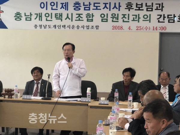 이인제 후보가 운전기사님들의 건의사항을 청취하겠다고 하자 한 운전자는 “충남 농특산물 육성을 위한 상생으로 택시광고를 2007년부터 해왔으나, 현재 10년째 대당 광고비가 월 25,000원으로 동결된 광고비를 도지사가 되신다면 35,000원으로 인상해 달라”는 요구와 “택시발전법에 따르면 2년마다 택시비를 의무적으로 조정토록 되어있지만 2013년 이후 인상되지 않고 있다”며 건의사항에 대한 검토를 요청했다.