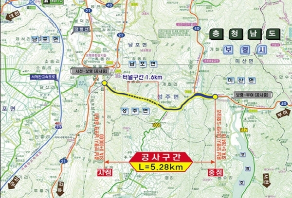 한편, 지난 2016년 착공한 국도 40호 보령~부여 도로건설공사는 오는 2023년까지 미산면 도화담리에서 부여군 구룡면 주정리까지 총연장 12.8km에 기존 2차로 국도를 4차로로 확장하는 공사이다.