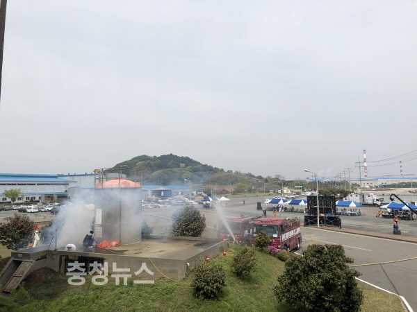 충남 서천군은 26일 2018년 재난대응 안전한국훈련 일환으로 LS메탈 장항공장에서 유해화학물질 유출사고 대응을 위한 현장종합훈련을 실시했다.